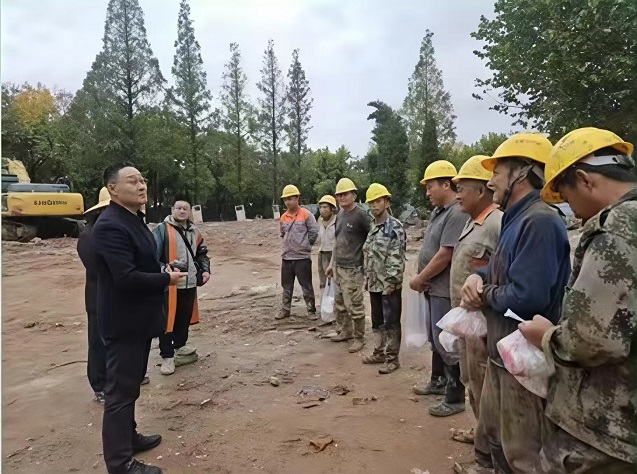 慰问期间,院领导深入工地,与在恶劣天气中坚持作业的工人们亲切交流,并代表设计院向他们致以节日的诚挚问候和衷心感谢。他表示,在阖家团圆的中秋佳节和国庆长假,工人们冒雨奋战,这种“舍小家、为大家”的奉献精神令人感动。他反复叮嘱现场负责人和每一位工人:“天气恶劣,安全红线一刻不能放松;工期紧张,质量底线一丝不能含糊。必须在确保施工安全和工程质量万无一失的前提下,科学统筹,全力推进,确保圆满完成学校交付的重要任务。”随后,为大家发放了象征团圆的中秋月饼和过节费,将设计院的温暖关怀送至每位一线建设者心中。
